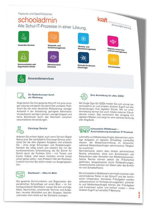 schooladmin ist die ganzheitliche Lösung für Schulträger und Schulen, um alle digitalen Kernprozesse und pädagogischen Anwendungen abzubilden. Die Edu-Tech-Suite schooladmin umfasst alle Funktionen die Schulträger und Schule benötigen für den sicheren, kostengünstigen und professionellen Betrieb der digitalen Schule. Ob schulweit oder zentral über alle Schulstandorte – mit unserer Lösung gelingt die erfolgreiche digitale Transformation.